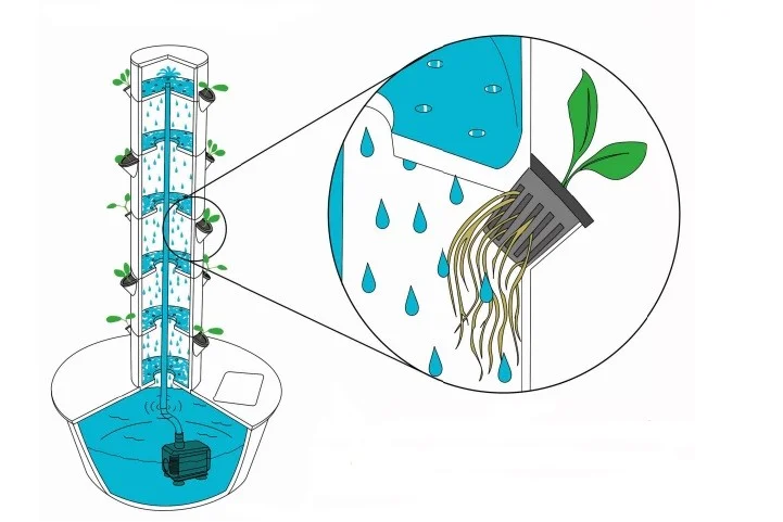 در این سیستم، محلول آب و مواد مغذی به صورت مهپاشی یا باران ریز به ریشه گیاهان در فضای بسته دستگاه رسانده میشود و گیاه بدون نیاز به خاک رشد میکند. در پالیستا ۵ طبقه، ریشه گیاهان در هوا آویزان بوده و بهطور متناوب با محلول مغذی تغذیه میشوند. این فرآیند باعث میشود ریشهها ۱۰۰٪ اکسیژن دریافت کنند و انتقال مواد غذایی در بالاترین سطح خود انجام شود. پالیستا ۵ طبقه مجهز به پمپ آب و تایمر اتوماتیک است. پمپ، آب و محلول غذایی را از مخزن به بالای ستون هدایت کرده و از آنجا محلول بهصورت یکنواخت روی ریشه گیاهان پاشیده میشود. سپس محلول اضافی دوباره به مخزن بازمیگردد تا در چرخه بعدی استفاده شود. تایمر، این چرخه را بهطور خودکار تنظیم کرده و نیاز به آبیاری و مراقبت مداوم را از بین میبرد.