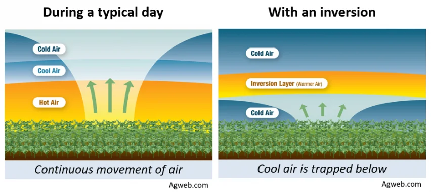 وارونگی دمایی (temperature inversion) بدترین شرایط است. در این حالت، لایه هوای سرد نزدیک زمین زیر هوای گرم قرار می گیرد و حرکت عمودی هوا متوقف می شود. ذرات سم به جای پخش عمودی، به صورت افقی و افقی مسافت های طولانی (تا چند کیلومتر) جابجا می شوند. مطالعات نشان می دهد که در اینورژن، drift ذرات کوچک (کمتر از ۲۰۰ میکرون) می تواند هزاران فوت ادامه یابد و حتی volatilization (تبخیر) برخی سموم را تشدید کند.