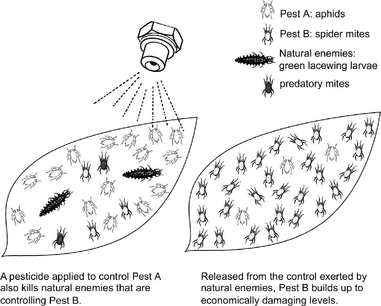 وقتی یک آفت اصلی کنترل میشود، اما دشمنان طبیعی از بین میروند، گونهای که قبلاً کماهمیت بود (تریپس، کنه، شته، کرمهای کوچکتر) به آفت غالب تبدیل میشود. این پدیده در پنبه، سبزیجات، مرکبات و حتی باغات پسته ایران بارها گزارش شده است.
