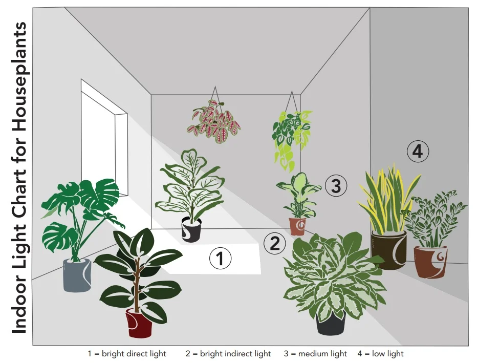 نور خورشید نقش کلیدی در فتوسنتز و تولید انرژی برای گیاهان ایفا می کند. بسیاری از گیاهان گلدار، مانند رز، گل های آفتابگردان یا حتی گیاهان آپارتمانی مانند ارکیده، برای گلدهی به حداقل ۶ تا ۸ ساعت نور مستقیم خورشید در روز نیاز دارند. اگر گیاه در سایه قرار گیرد یا نور کافی دریافت نکند، انرژی خود را صرف رشد برگ ها می کند تا سطح فتوسنتز را افزایش دهد، اما از تولید گل صرف نظر می کند. برای مثال، گیاهانی که در داخل خانه نگهداری می شوند، اغلب به دلیل پنجره های شمالی یا پرده های ضخیم، نور کافی دریافت نمی کنند. شما می توانید مکان قرار گیری گیاه خود در آپارتمان را براساس تصویر زیر تنظیم نمایید:
